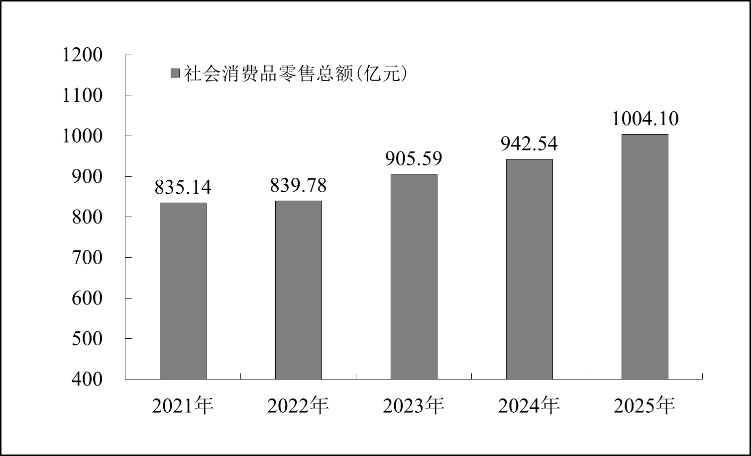全年社会消费品零售总额1004.10亿元,比上年增长6.5%。