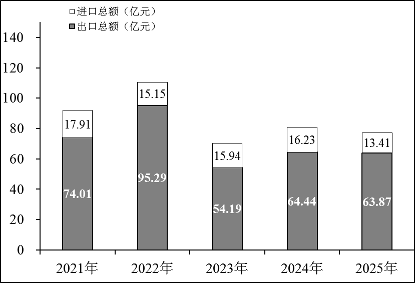 全年进出口总额77.28亿元,比上年下降4.1%。其中,出口63.87亿元,下降0.8%;进口13.41亿元,下降17.5%。