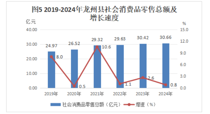 全年社会消费品零售总额30.66亿元,比上年增长0.8%。分行业看,批发业销售额13.93亿元,下降35.8%,零售业销售额26.24亿元,增长4.2%,住宿业营业额0.56亿元,下降14.6%,餐饮业营业额5.72亿元,增长17.2%。