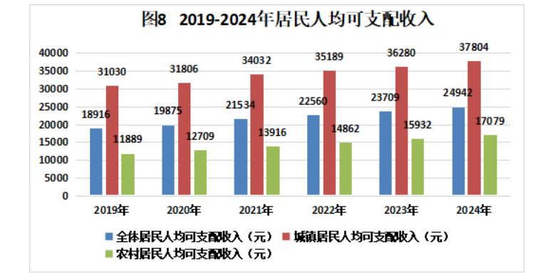 全体居民人均可支配收入24942元,比上年增长5.2%。城镇居民人均可支配收入37804元,比上年增长4.2%。农村居民人均可支配收入17079元,比上年增长7.2%。