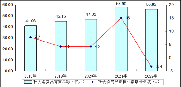全年社会消费品零售总额55.92亿元,比上年增长-3.4%。