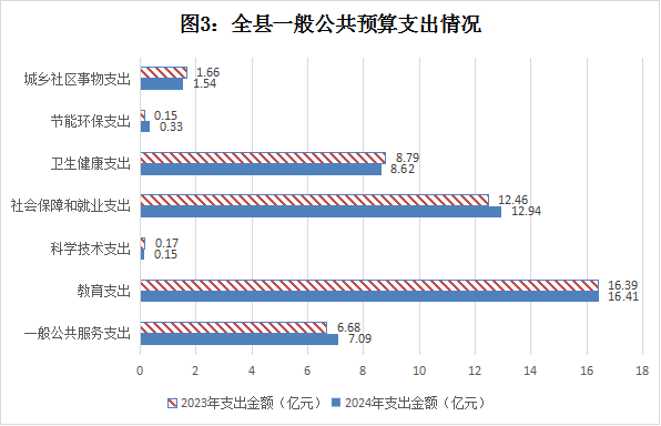 2024年全县一般公共预算收入10.78亿元,增长9.16%,一般公共预算支出69.90亿元,增长8.67%。其中,一般公共服务支出7.09亿元,增长6.02%;教育支出16.41亿元,增长0.10%;科学技术支出0.15亿元,下降14.48%;社会保障和就业支出12.94亿元,增长3.83%;卫生健康支出8.62亿元,下降1.93%;节能环保支出0.33亿元,增长114.12%;城乡社区事务支出1.54亿元,下降7.50%;交通运输支出2.04亿元,增长2.76%。
