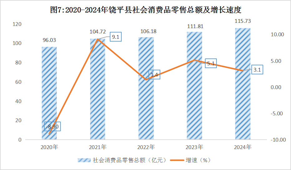2024年,全县社会消费品零售总额115.73亿元,同比增长3.1%。限上批发业商品销售总额19.82亿元,同比下降5.9%,限上零售业商品销售总额9.28亿元,同比增长12.3%。限上住宿业营业额3501.9万元,同比增长145.1%,限上餐饮业营业额853万元,同比增长3.2%。