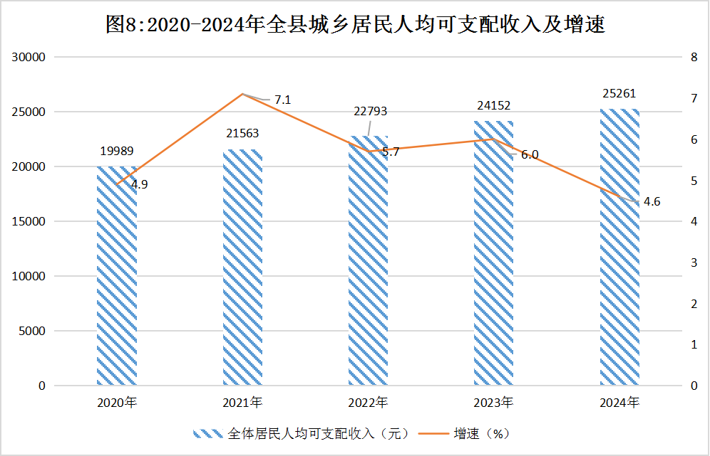 2024年,全县全体居民人均可支配收入25261元,增长4.6%,其中城镇居民人均可支配收入29075元,增长4.0%,农村居民人均可支配收入21573元,增长5.1%。