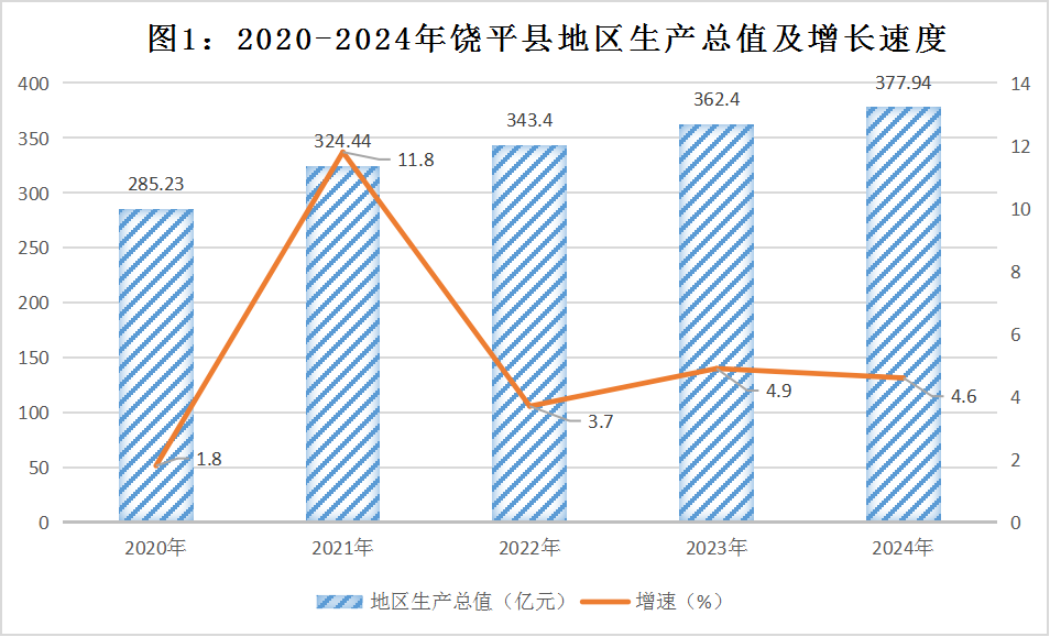 经市统计局统一核算,全县2024年实现地区生产总值(初步核算数)377.94亿元,按可比价同比增长4.6%。其中,第一产业增加值96.98亿元,同比增长5.1%,对全县地区生产总值增长的贡献率为29.8%;第二产业增加值124.62亿元,增长5.7%,对全县地区生产总值增长的贡献率为39.0%;第三产业增加值156.34亿元,增长3.4%,对全县地区生产总值增长的贡献率为31.2%。第三产业增加值中,交通运输、仓储和邮政业下降1.8%,批发和零售业增长5.0%,住宿和餐饮业增长5.6%,金融业增长8.5%,房地产业增幅持平。全县人均GDP为46217元,增长4.6%,约为全省的40.6%,比2023年下降0.7个百分点,为全市人均地区生产总值的84.9%,比2023年提高1.0个百分点。