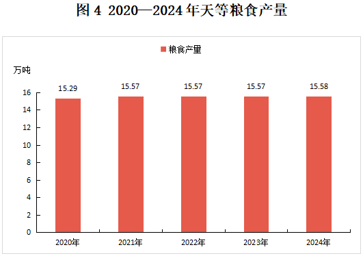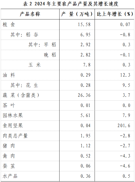 全年粮食产量15.58万吨,比上年增加0.01万吨,增产0.07%。其中,春收粮食产量428吨,增产8.0%;早稻产量2.92万吨,增产0.3%;秋粮产量7.44万吨,增产0.6%。全年谷物产量14.77万吨,减产0.2%。其中,稻谷产量6.95万吨,减产0.8%;玉米产量7.8万吨,增产0.3%。