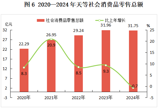 全年社会消费品零售总额31.75亿元,比上年下降0.7%。按经营单位所在地分,城镇消费品零售额增长2.2%,乡村消费品零售额下降8.5%。按消费类型分,餐饮收入增长10.1%,商品零售下降1.5%。