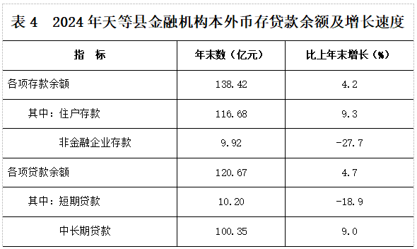 年末金融机构本外币各项存款余额138.42亿元,比年初增加5.58亿元,其中住户存款116.68亿元,比年初增加9.92亿元。年末金融机构本外币各项贷款余额120.67亿元,比年初增加5.46亿元。
