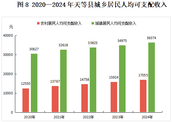 全年居民人均可支配收入22732元,比上年名义增长5.3%。按常住地分,城镇居民人均可支配收入36374元,比上年名义增长4.0%。农村居民人均可支配收入17055元,比上年名义增长7.1%。城乡居民人均收入比为2.13:1,比上年缩小0.07。