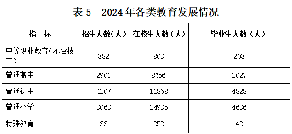 全年中等职业教育(不含技工)招生382人,在校生803人,毕业生203人。普通高中招生2901人,在校生8656人,毕业生2027人。普通初中招生4207人,在校生12868人,毕业生4828人。普通小学招生3063人,在校生24935人,毕业生4636人。特殊教育招生33人,在校生252人,毕业生42人。学前教育在园幼儿6375人。九年义务教育巩固率97.9%,高中阶段毛入学率94.2%。