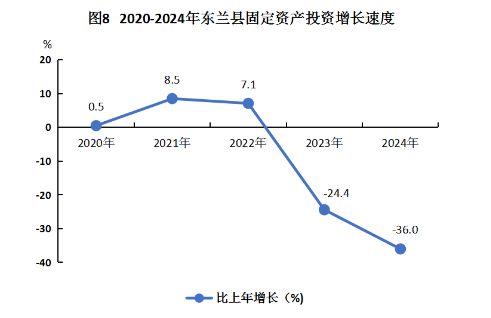 全年全县固定资产投资(不含农户)比上年下降36.0%。其中,第一产业投资增长99.5%;第二产业投资下降21.1%,其中工业投资下降19.0%;第三产业投资下降47.5%。基础设施投资[8]下降44.2%。民间固定资产投资[9]下降34.1%。