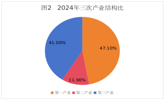 初步核算,全年全县生产总值(GDP)211.62亿元,按可比价计算比上年增长5.0%。分产业看,第一产业增加值99.68亿元,增长3.9%;第二产业增加值25.23亿元,增长13.2%;第三产业增加值86.70亿元,增长3.5%。三次产业增加值占地区生产总值的比重分别为47.1%、11.9%和41.0%,对经济增长的贡献率分别为35.2%、35.8%和29.0%。
