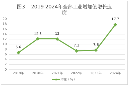 全年全部工业总产值60.83亿元,比上年增长10.2%,其中规模以上工业总产值 41.37亿元,比上年增长14.4%。全部工业增加值21.0亿元,比上年增长17.7%,其中规模以上工业增加值17.6亿元,比上年增长30.3%。在规模以上工业增加值中,分门类看,采矿业增长增加值0.4亿元,比上年下降2.3%;制造业增加值10.5亿元,比上年增长67.2%;电力、燃气及水的生产和供应业增加值6.6亿元,比上年增长4.2%。