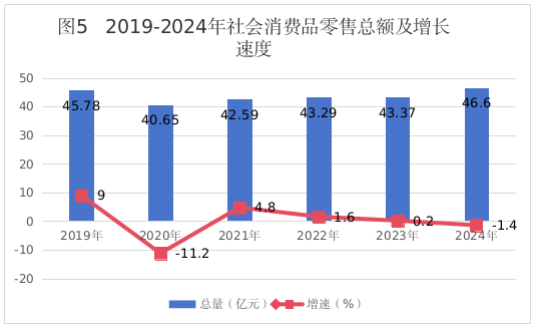 全年社会消费品零售总额46.6亿元,比上年下降1.4%。