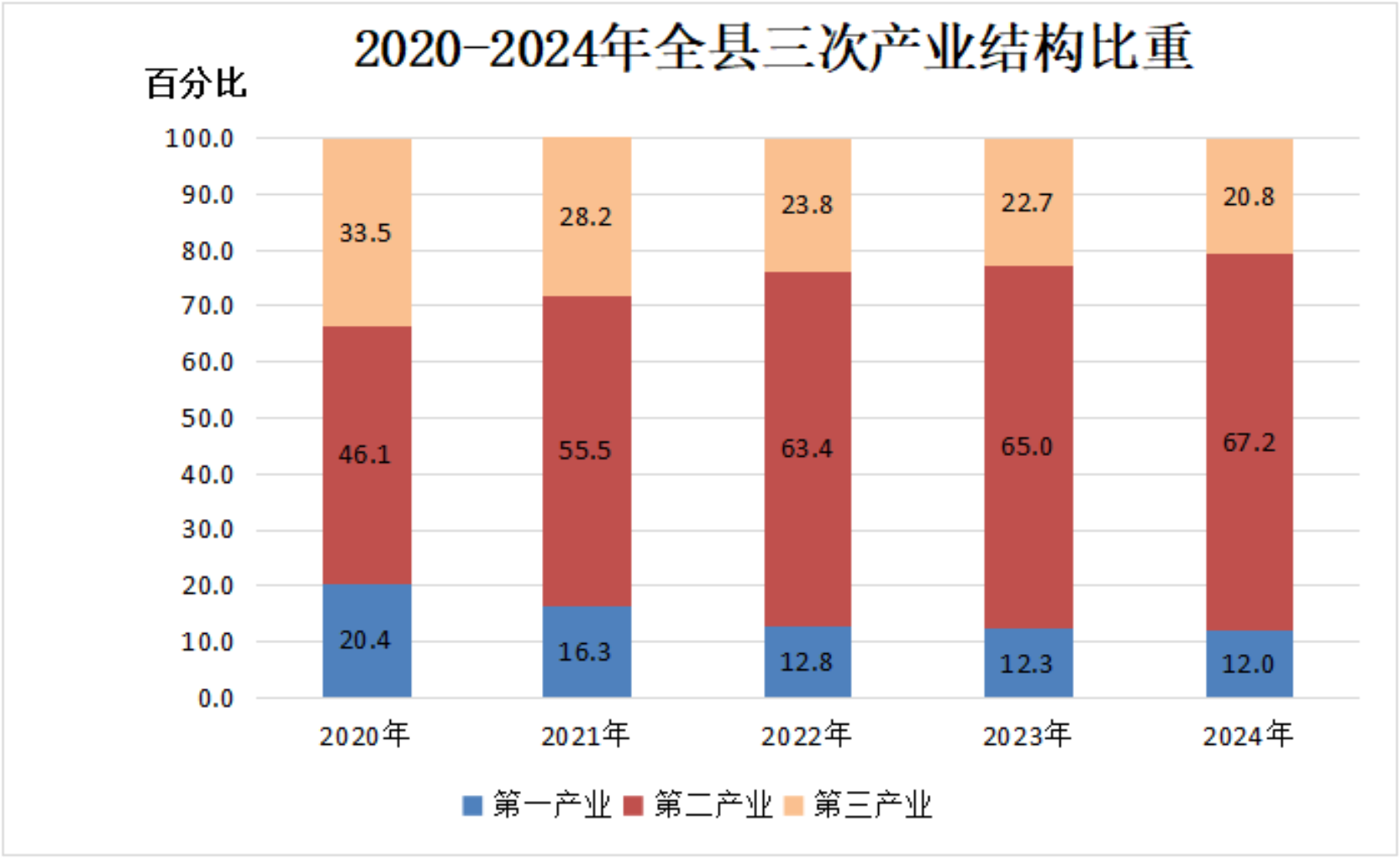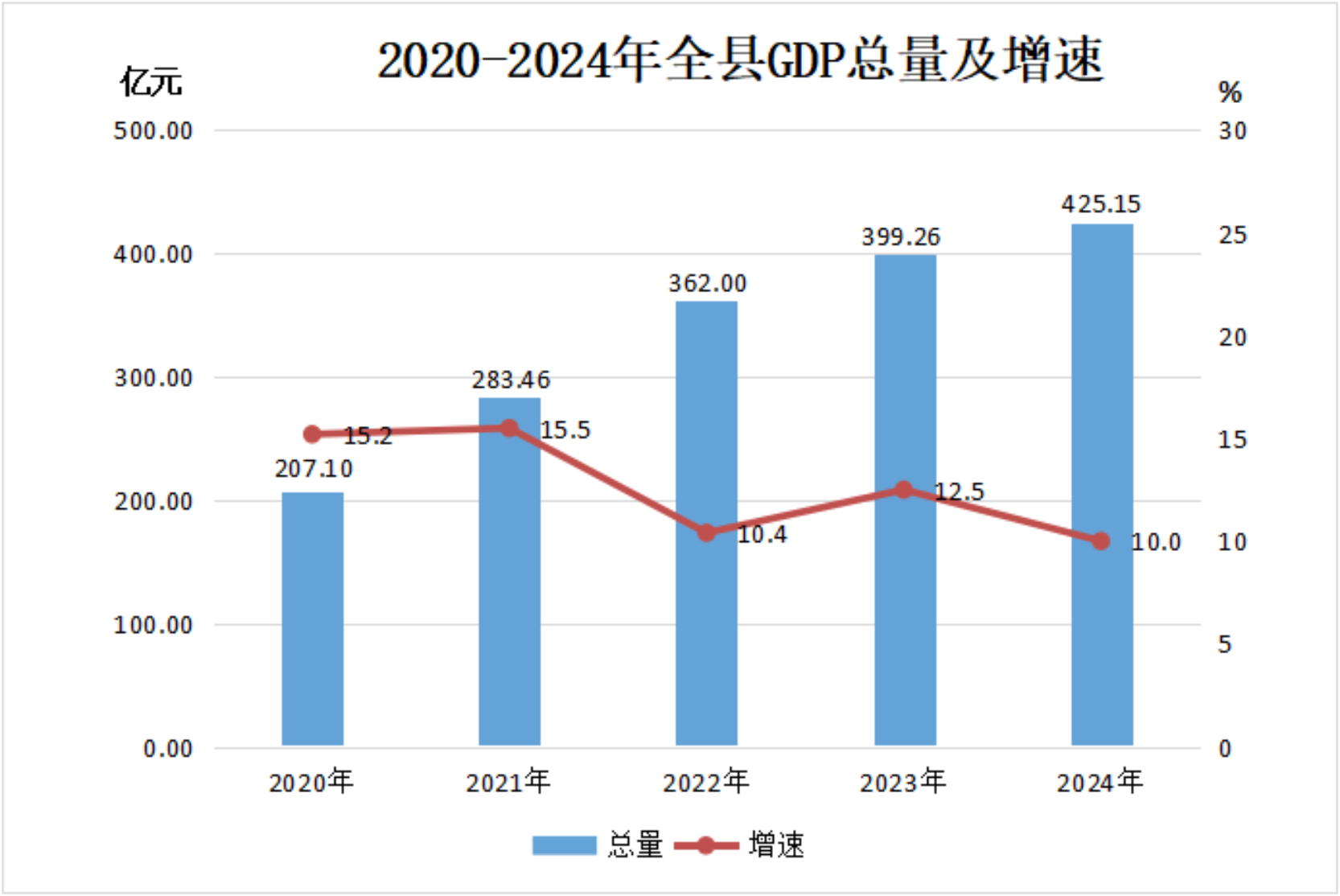 初步核算,全年全县实现生产总值(GDP)425.15亿元,按可比价格计算,比上年增长10.0%。其中,第一产业增加值51.02亿元,增长3.9%;第二产业增加值285.58亿元,增长17.5%;第三产业增加值88.56亿元,下降2.9%。第一、二、三产业增加值占地区生产总值的比重分别为12.0%、67.2%、20.8%。按常住人口计算,全年人均地区生产总值105197元,比上年增长10.8%。