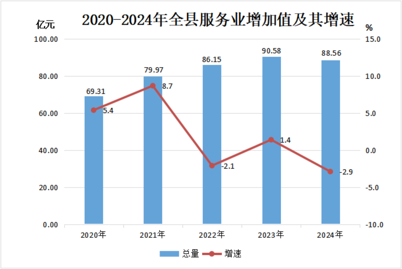全年批发和零售业增加值13.01亿元,比上年下降25.3%;交通运输、仓储和邮政业增加值5.75亿元,增长4.6%;住宿和餐饮业增加值2.51亿元,增长6.4%;金融业增加值7.20亿元,增长2.3%;房地产业增加值14.52亿元,下降0.2%;其他服务业增加值43.11亿元,增长3.2%。规模以上服务业企业营业收入比上年增长15.8%。