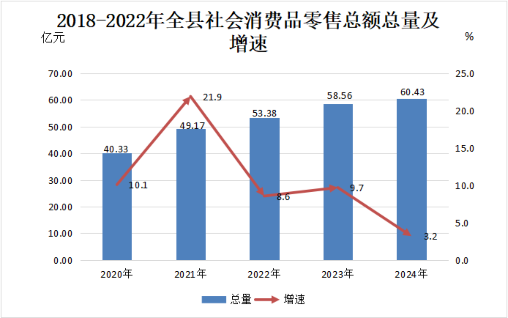 全年实现社会消费品零售总额60.43亿元,比上年增长3.2%。