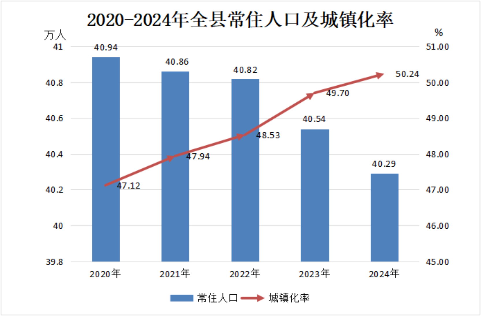 年末全县常住人口为40.29万人,其中城镇人口为20.24万人,城镇化率为50.24%。