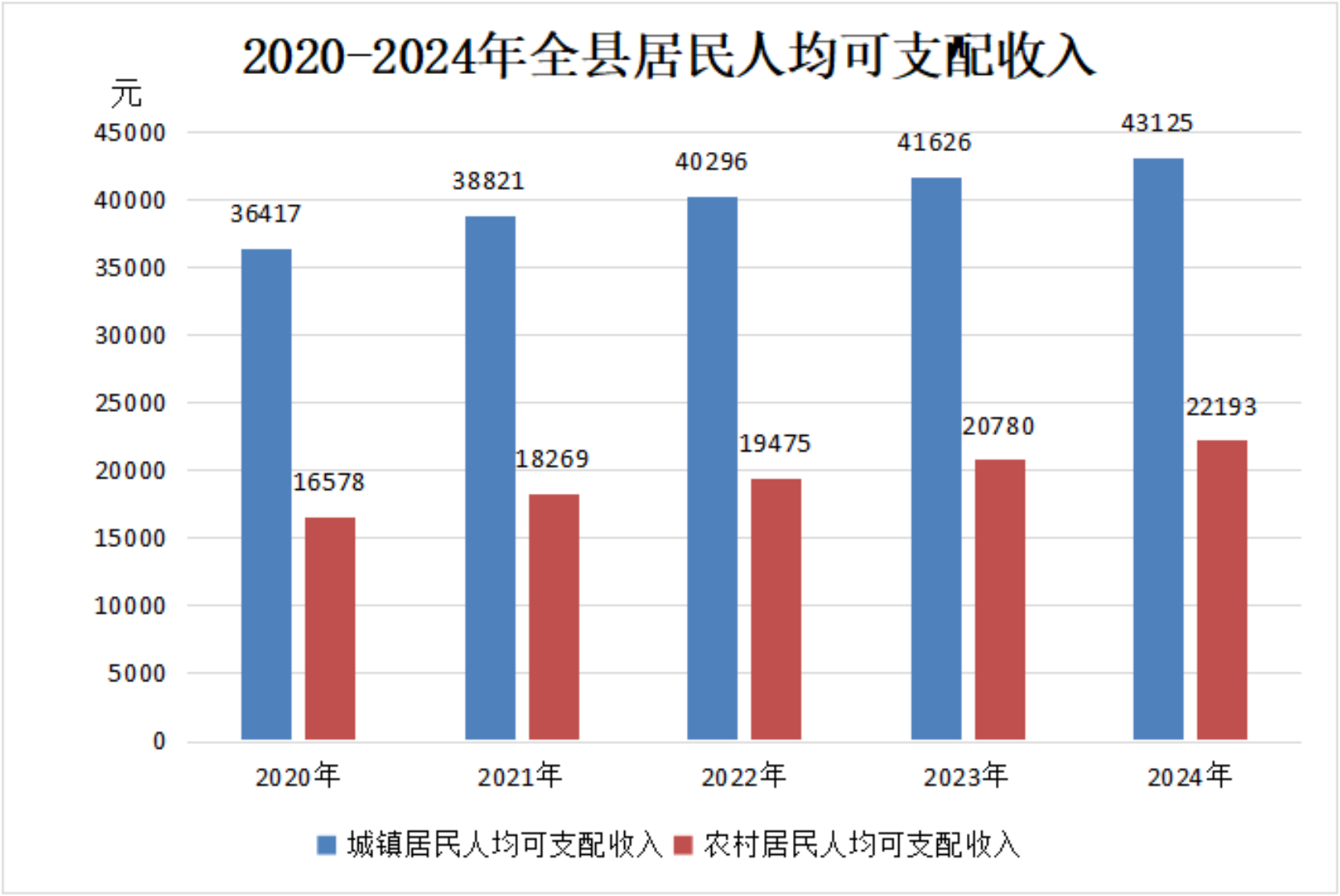 城镇居民人均可支配收入43125元,同比增长3.6%;农村居民人均可支配收入22193元,同比增长6.8%。
