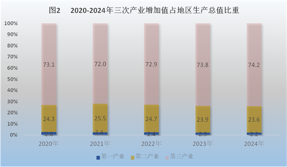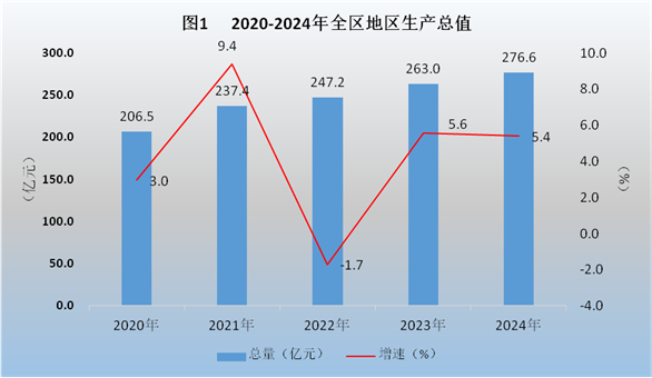 初步核算,全年全区生产总值[2](GDP)276.6亿元, 按可比价格计算,比上年增长5.4%。其中,第一产业增加值6.1亿元,增长4.7%;第二产业增加值65.2亿元,增长5.6%;第三产业增加值205.3亿元,增长5.3%。[3]三次产业结构为2.2:23.6:74.2。按常住人口计算,人均地区生产总值91147元(折合12422美元),增长4.3%。