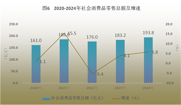 全年社会消费品零售总额193.8亿元,比上年增长5.8%。按经营地统计,城镇消费品零售额163.1亿元,比上年增长5.8%;乡村消费品零售额30.7亿元,比上年增长5.6%。按消费形态统计,商品零售169.9亿元,比上年增长5.8%;餐饮收入23.9亿元,比上年增长5.5%。