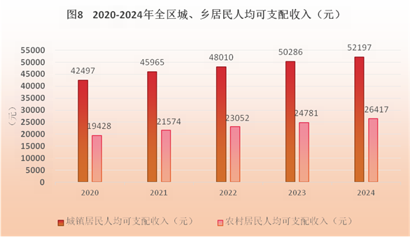 全年全区常住居民人均可支配收入50255元,比上年增长4.0%。按常住地分,城镇常住居民人均可支配收入52197元,比上年增长3.8%。全年农村常住居民人均可支配收入26417元,比上年增长6.6%。