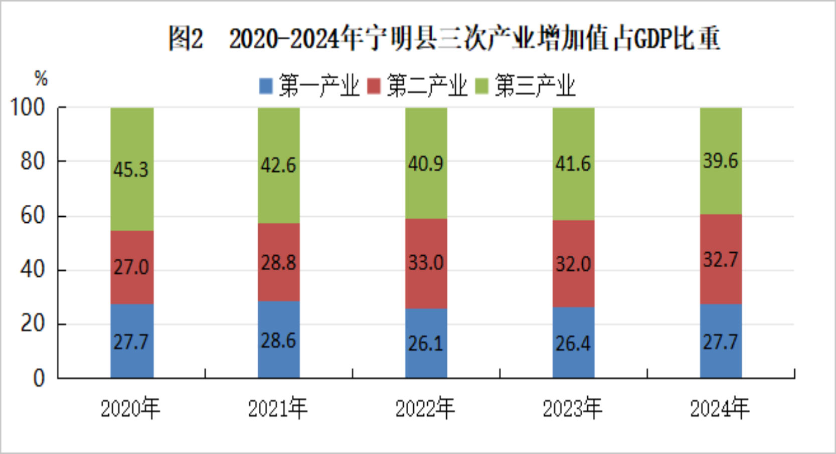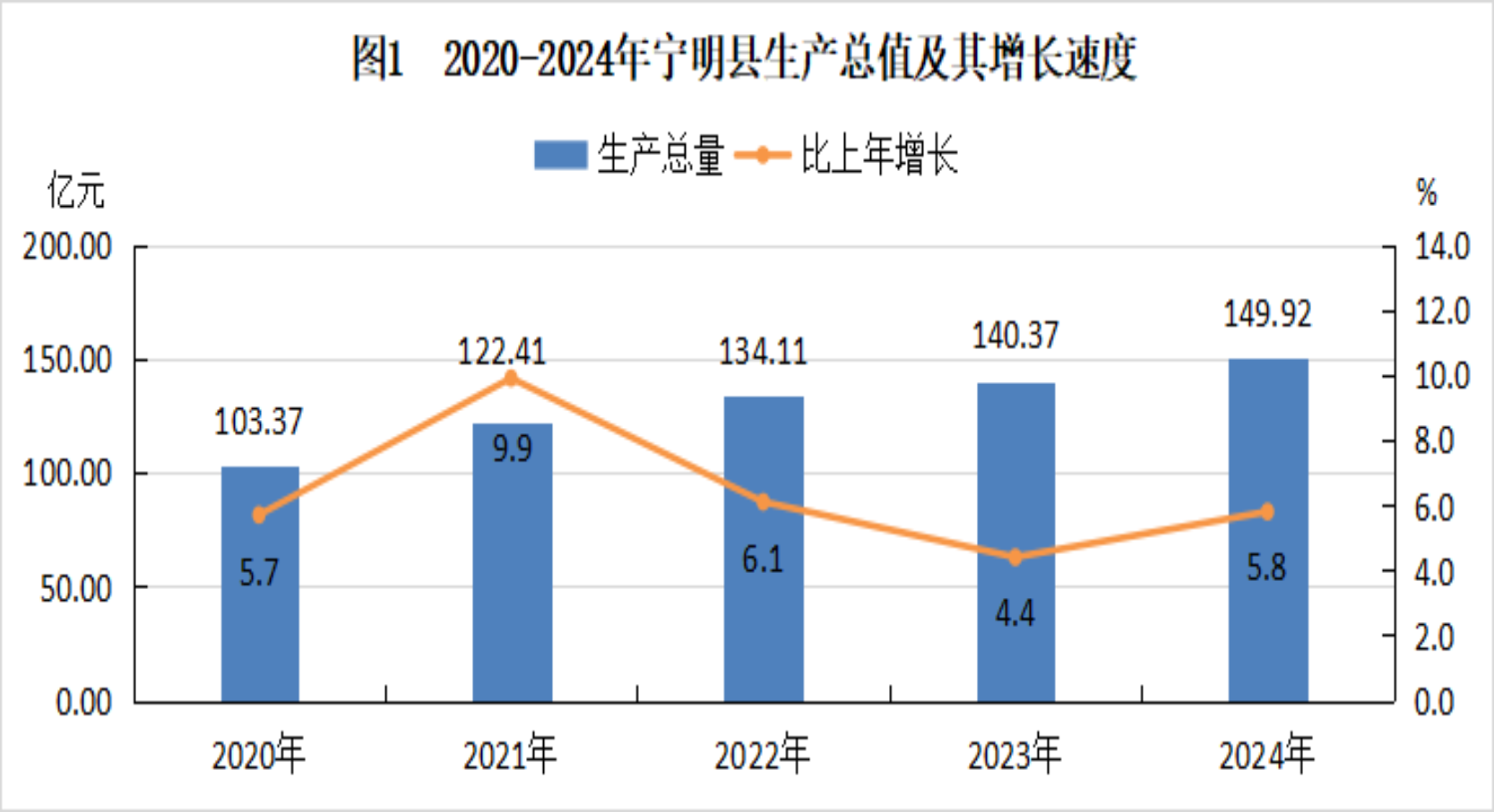 初步核算,2024年全年全县生产总值(GDP)149.92亿元,按可比价计算,比上年增长5.8%。其中,第一产业增加值41.54亿元,增长4.3%;第二产业增加值48.98亿元,增长13.4%;第三产业增加值59.41亿元,增长1.0%。第一、二、三产业增加值占全县生产总值的比重分别为27.7%、32.7%和39.6%,对经济增长的贡献率分别为20.1%、73.2%和6.7%。按常住人口计算,全年人均地区生产总值48044元,比上年增长7.0%。