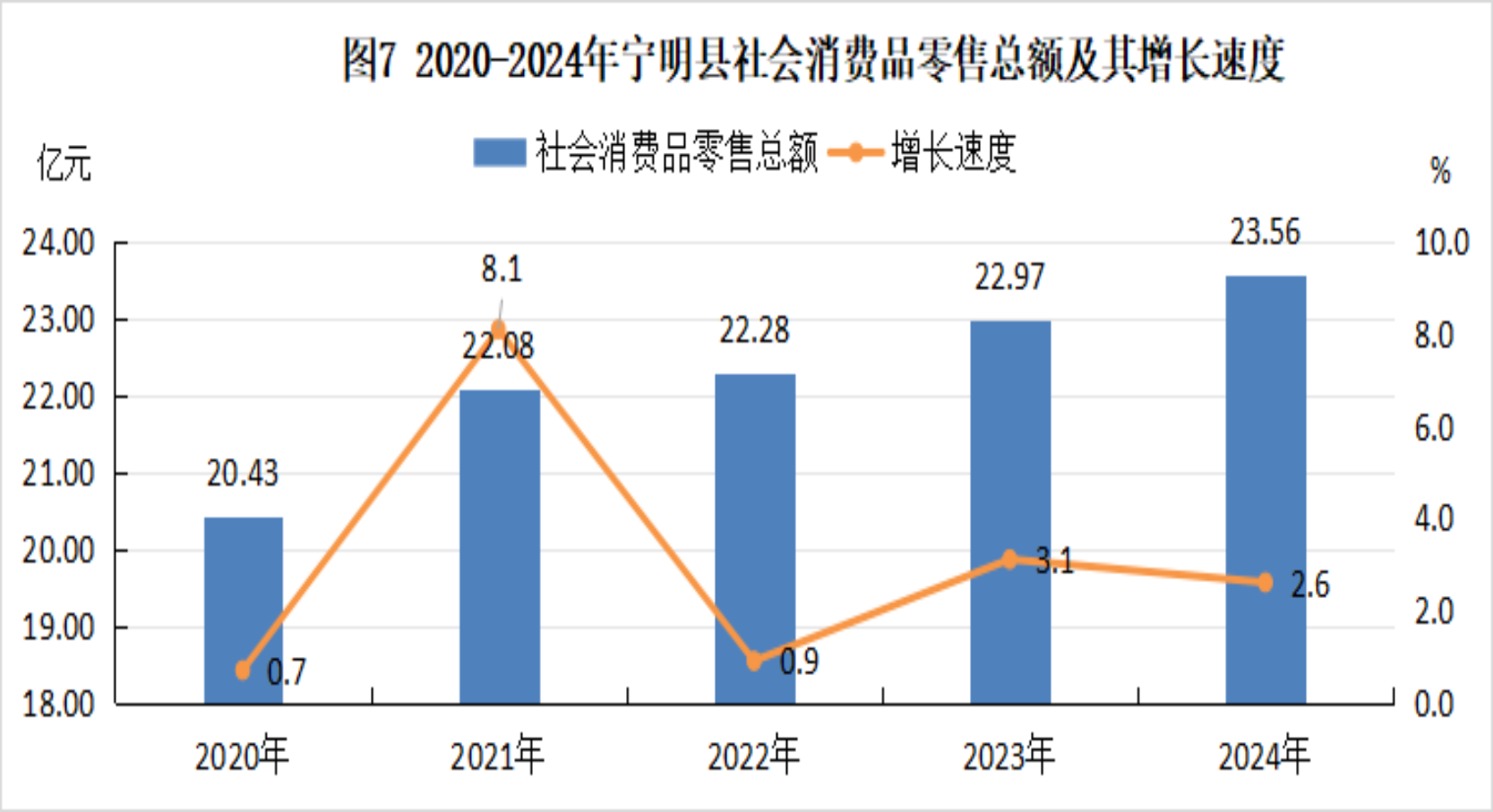 2024年社会消费品零售总额23.56亿元,同比增长2.6%,按消费所在地分,城镇消费同比增长0.4%,乡村消费增长11.8%。按消费形态分,餐饮收入下降15.5%,商品零售增长9.1%。