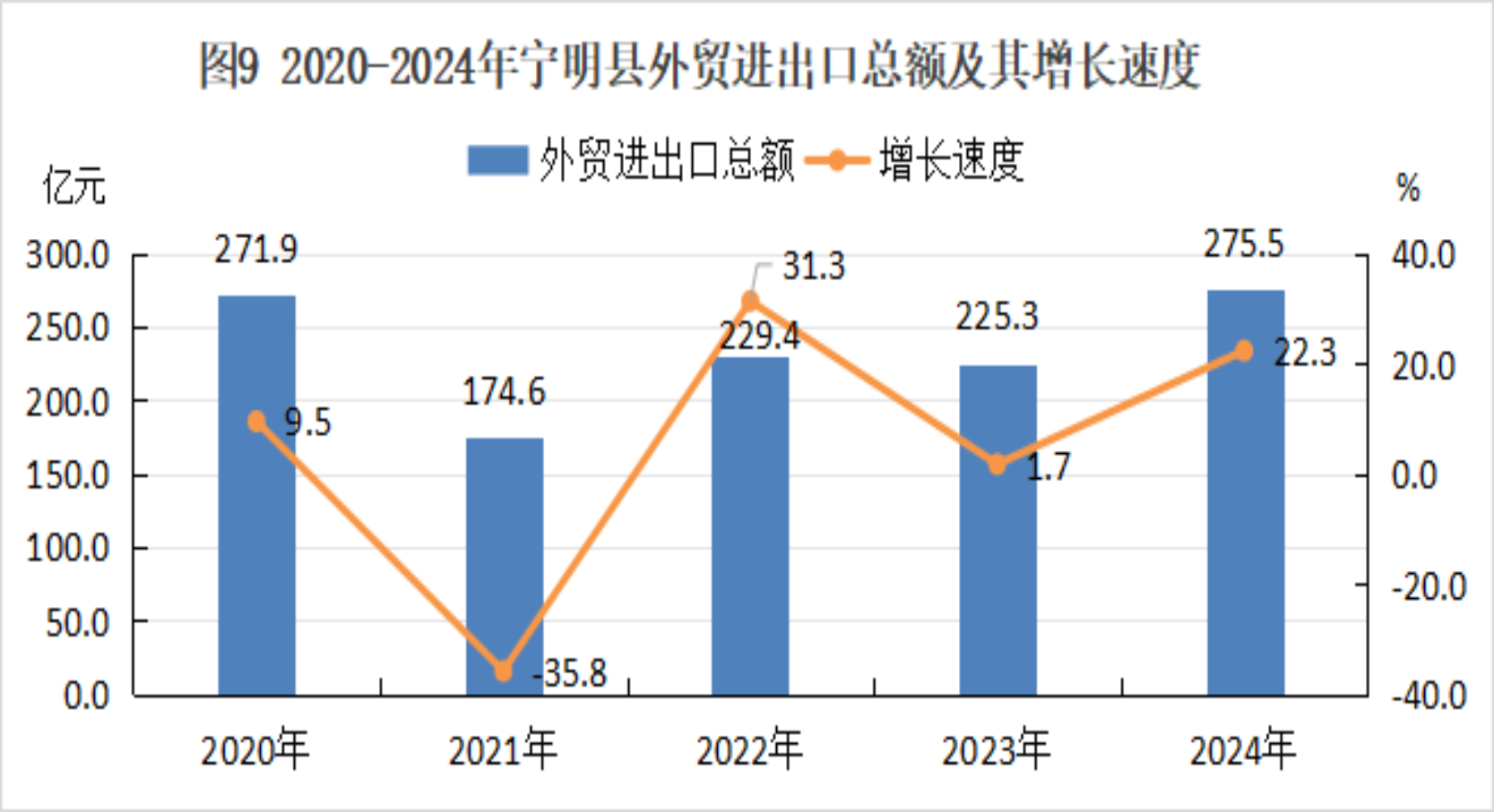 全年外贸进出口总额275.5亿元,比上年增长22.3%。其中,出口额为266.4亿元,增长31.6%;进口额为9亿元,下降60.6%。进出口差额(出口减进口)257.4亿元。