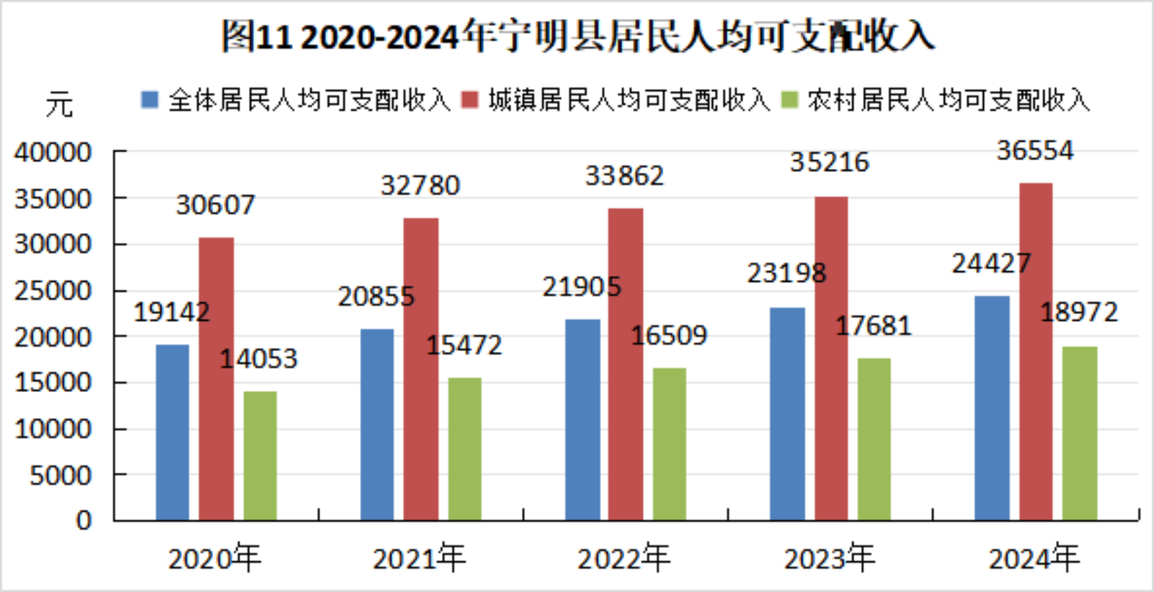 全年全体居民人均可支配收入24427元,名义增长率5.3%。城镇居民人均可支配收入36554元,名义增长率3.8%;农村居民人均可支配收入18972元,名义增长率7.3%。
