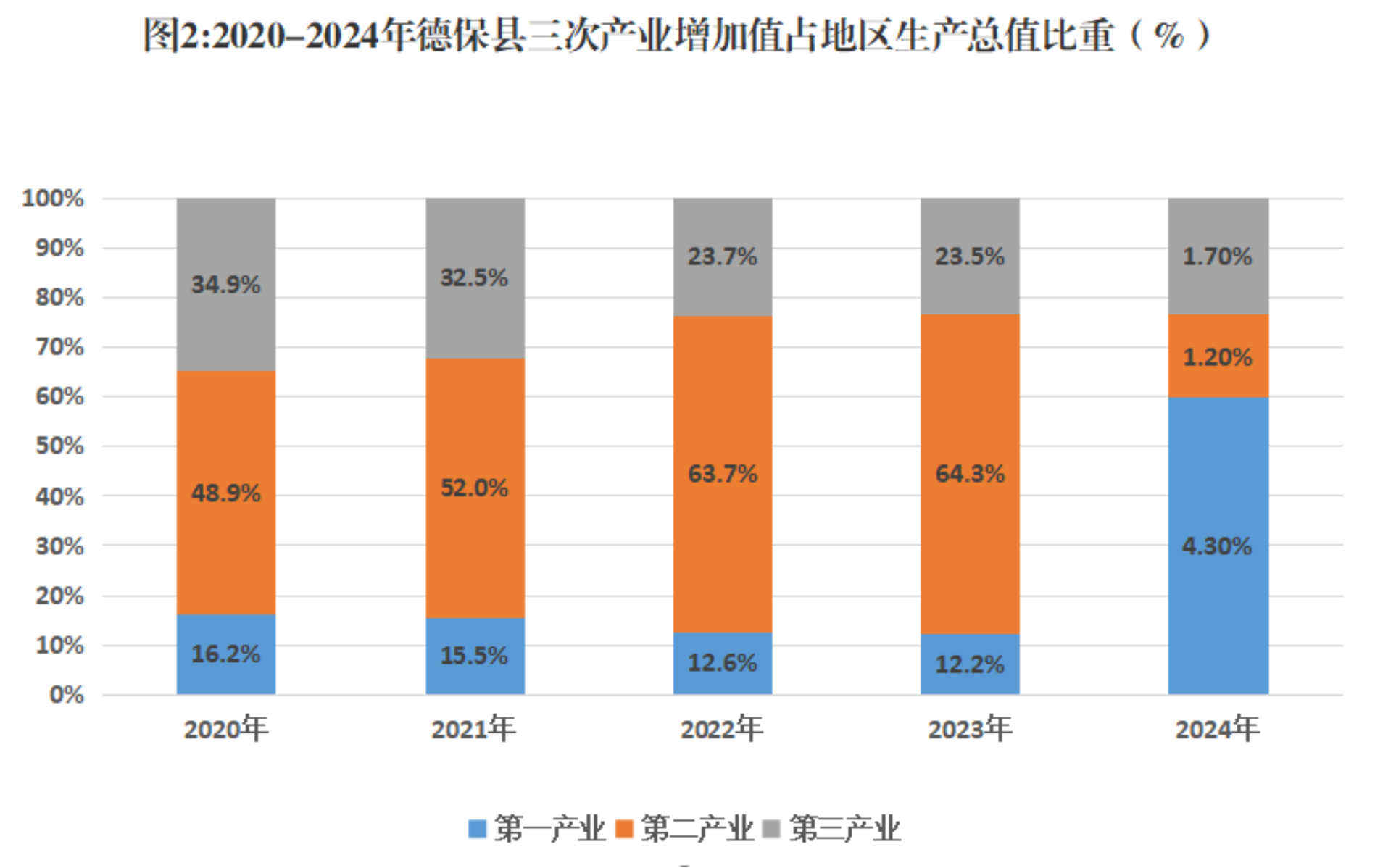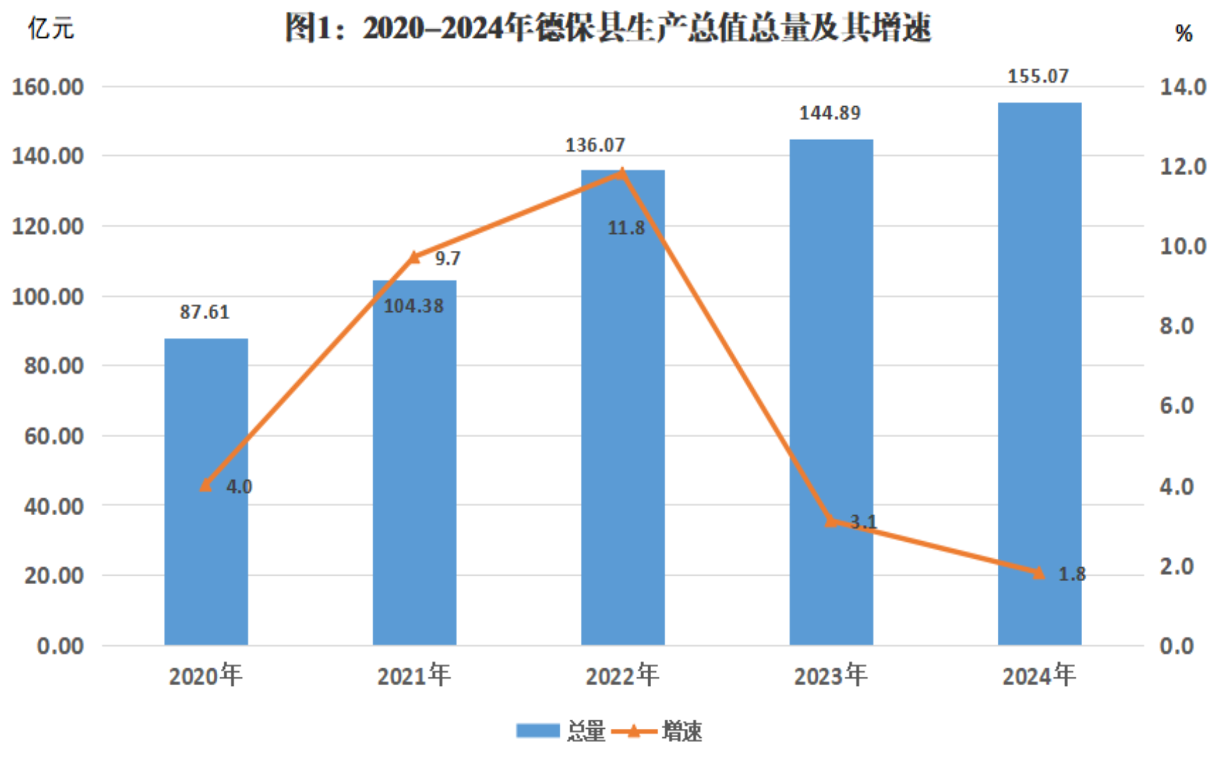 初步核算,全年全县生产总值[2](GDP)155.07亿元,按2020年不变价格计算,比上年增长1.8%。其中,第一产业增加值18.20亿元,增长4.3%;第二产业增加值93.47亿元,增长1.2%;第三产业增加值43.40亿元,增长1.7%。第一、二、三产业增加值占地区生产总值的比重分别为11.7%、60.3%和28%,对经济增长的贡献率分别为34.0%、34.7%和31.3%。按常住人口计算,全年人均地区生产总值59630元,比上年增长6.1%。