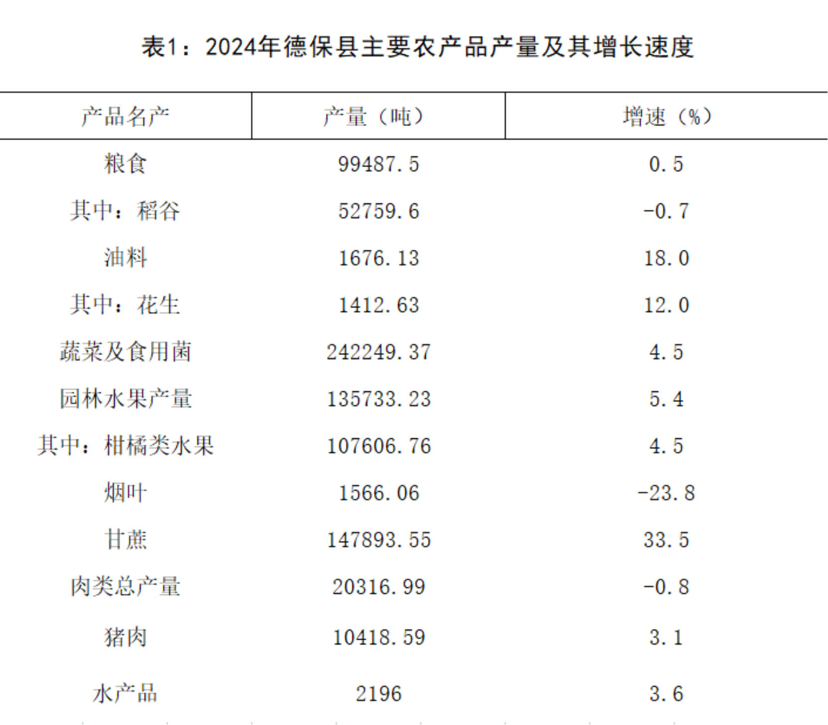 全年油料产量0.17万吨,比上年增产18.01%。糖料产量14.79万吨,增产33.5%。烟叶产量0.16万吨,减产23.76%。蔬菜产量(含食用菌)24.22万吨,增长4.74%。八角产量0.68万吨,增产10.03%。食用坚果产量0.02万吨,减产35.98%。园林水果产量13.57万吨,增长5.43%,其中柑橘类产量10.76万吨,增产4.51%,百香果产量0.71万吨,增产34.77%。茶叶产量6.88吨,增产8.18%。