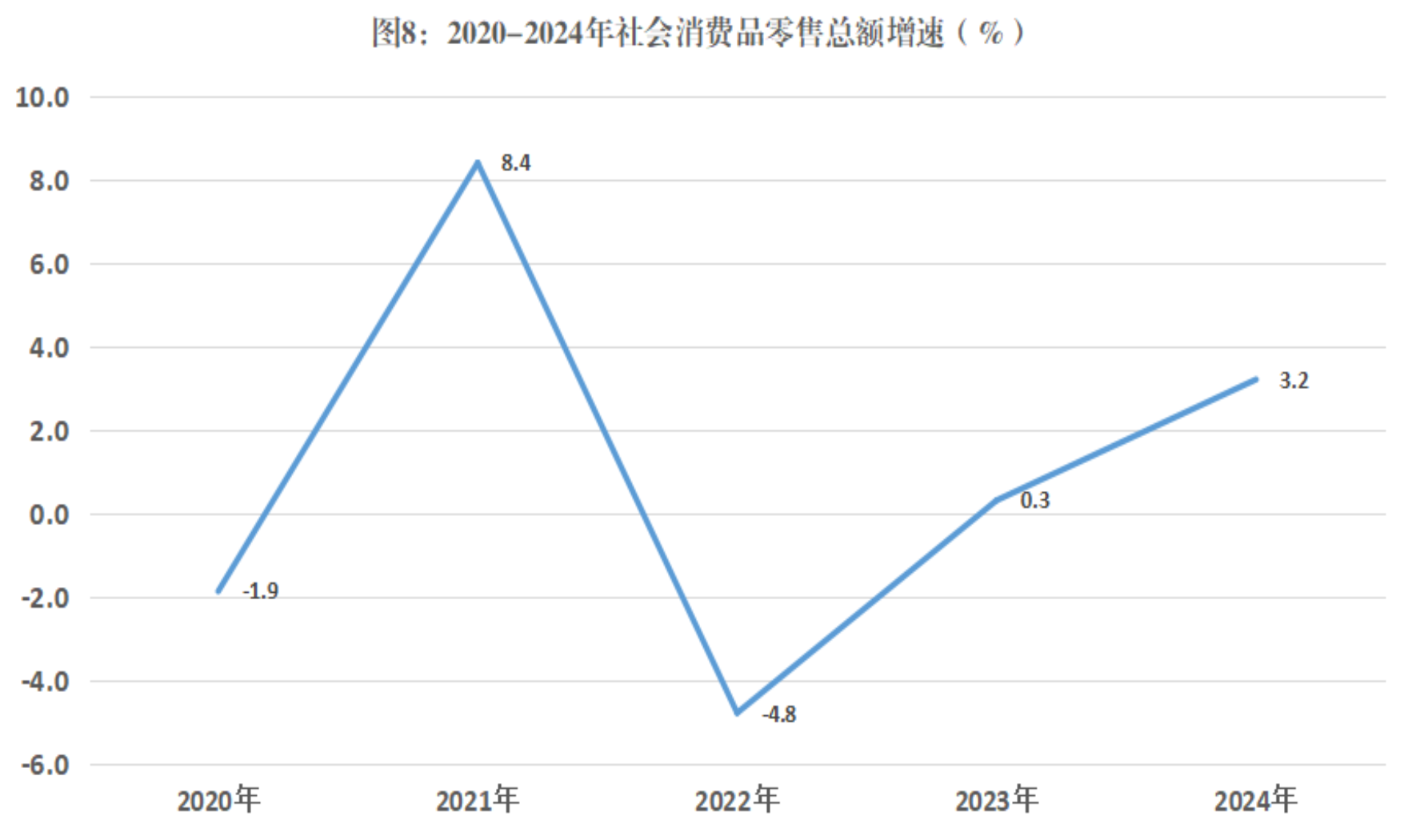 全年全县社会消费品零售总额同比增长3.2%。按经营单位所在地统计,城镇消费品零售额同比增长2.7%,乡村消费品零售额同比下降5.8%。按消费类型统计,餐饮收入同比下降7.7%,商品零售同比增长4.3%。
