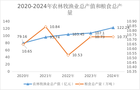 全年农林牧渔业总产值122.24亿元,可比价增速3.4%。其中:农业产值83.37亿元,可比价增速4.0%;林业产值3.66亿元,可比价增速4.9%;牧业产值22.47亿元,可比价增速-1.3%;渔业产值3.07亿元,可比价增速7.9%;专业及辅助性活动产值9.68亿元,可比价增速9.6%。
