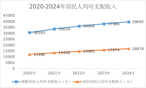 2024年城镇常住居民人均可支配收入39695元,比上年增长4.5%;农村常住居民人均可支配收入16874元,比上年增长6.3%。城乡居民人均可支配收入比为2.35。城镇居民人均消费性支出为29513元,同比增长3.2%;农村居民人均生活消费支出15162元,同比增长1.4%。