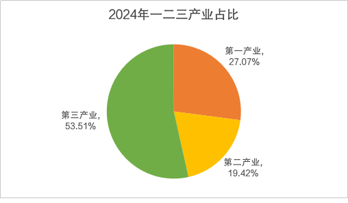 初步核算,2024年,全县完成地区生产总值229.42亿元,按照可比价计算同比增长5.5%。其中,第一产业增加值62.09亿元,同比增长2.9%;第二产业增加值44.56亿元,同比增长6.6%;第三产业增加值122.77亿元,同比增长6.3%。三次产业结构为27.07:19.42:53.51。人均地区生产总值达到71896元,同比增长5.5%。