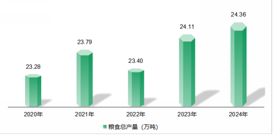 全年粮食总产量24.36万吨,比上年增长1.0%。其中,小春粮食作物产量6.74万吨,增长3.5%;大春粮食作物产量17.62万吨,增长0.1%。经济作物中,油料总产量3.93万吨,增长3.2%;蔬菜及食用菌总产量45.08万吨,增长4.1%;瓜果类产量1.58万吨,增长7.5%;园林水果产量2.15万吨,增长11.1%。
