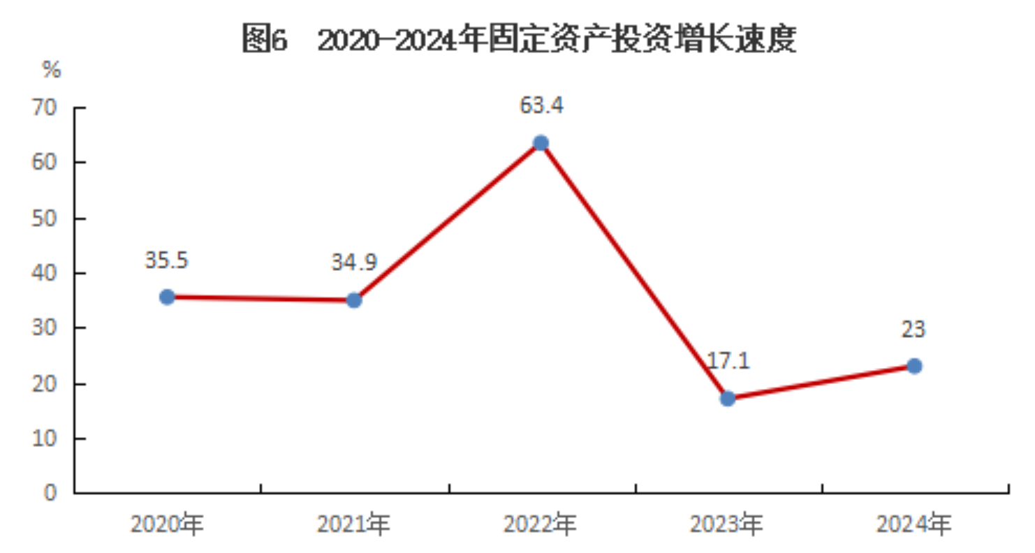 全县固定资产投资同比增长23.0%。分产业看,第一产业投资增长5548.2%;第二产业投资下降1.7%;第三产业投资增长25.1%。分领域看,基础设施投资增长38.8%;建安投资增长31.8%;工业投资下降1.7%。