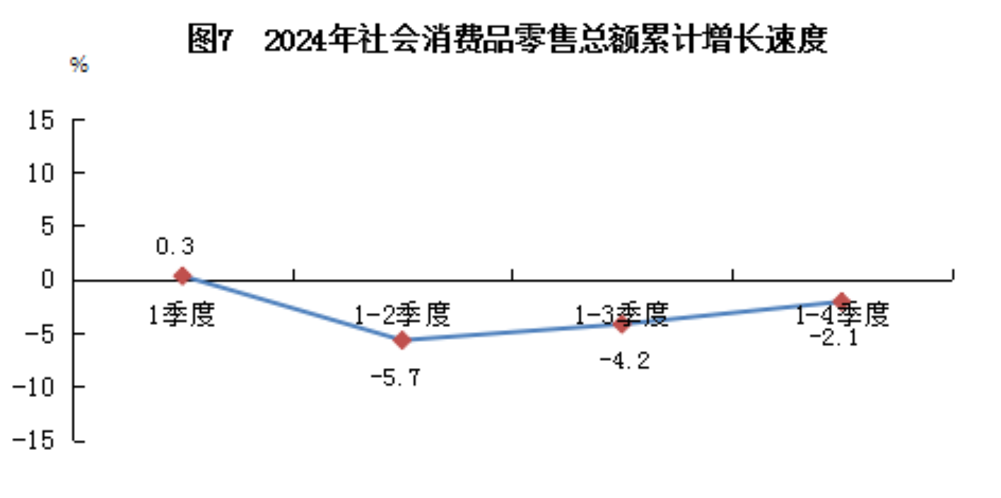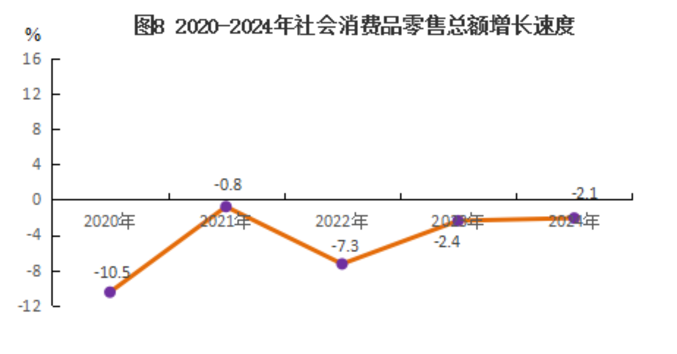 全年实现社会消费品零售总额同比下降2.1%。按经营地统计,城镇消费品零售额下降3.4%;乡村消费品零售额增长0.6%。