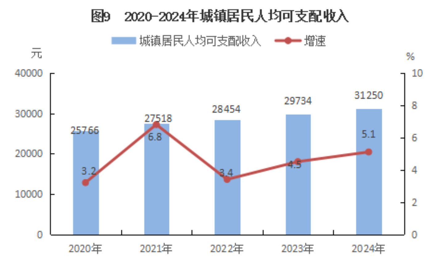 全年全县居民人均可支配收入23445元,同比增长(名义增长,下同)6.4%。城镇居民人均可支配收入31250元,增长5.1%;农村居民人均可支配收入19367元,增长6.7%。