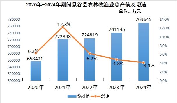 全年农林牧渔业总产值达769645万元,按可比价格计算,同比增长4.1%。其中:其中农业产值346608万元,林业产值295047万元,牧业产值80732万元,渔业产值33195万元,农林牧渔服务业产值14063万元。