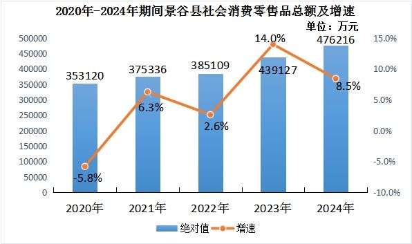 全年完成社会消费品零售总额476216万元,同比增长8.5%。按销售单位所在地分,城镇消费品零售额370806万元,增长9.7%;乡村消费品零售额105410万元,增长4.4%。按消费形态分,商品零售367200万元,增长8.1%;餐饮收入109016万元,增长9.7%。