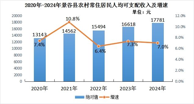 全年景谷县全体居民人均可支配收入27983元,比上年增加1298元,同比增长4.9%;城镇常住居民人均可支配收入41339元,比上年增加1475元,增长3.7%;农村常住居民人均可支配收入17781元,比上年增加1163元,增长7%。全县全体居民消费支出16379元,比上年增加989元,同比增长6.4%;城镇常住居民人均消费支出22506元,比上年增加1283元,增长6%;农村常住居民人居消费支出11699元,比上年增加765元,增长7%。