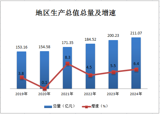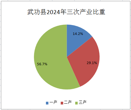 2024年武功县完成地区生产总值211.07亿元,按可比价格计算,同比增长6.4%。其中,第一产业增加值30亿元,增长3.3%;第二产业增加值61.32亿元,增长8.6%;第三产业增加值119.75亿元,增长6.0%。三次产业结构为14.2:29.1:56.7。全年非公经济增加值为126.25亿元,非公经济增加值占地区生产总值比重59.8%。