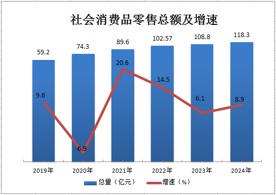 2024年全县实现社会消费品零售总额118.31亿元,同比增长8.9%。分行业类别看,批发业销售额同比增长1.3%;零售业销售额同比增长13.4%;住宿业营业额同比增长0.8%;餐饮业营业额同比增长2.0%。其中:限额以上单位消费品零售额同比增长19.1%。