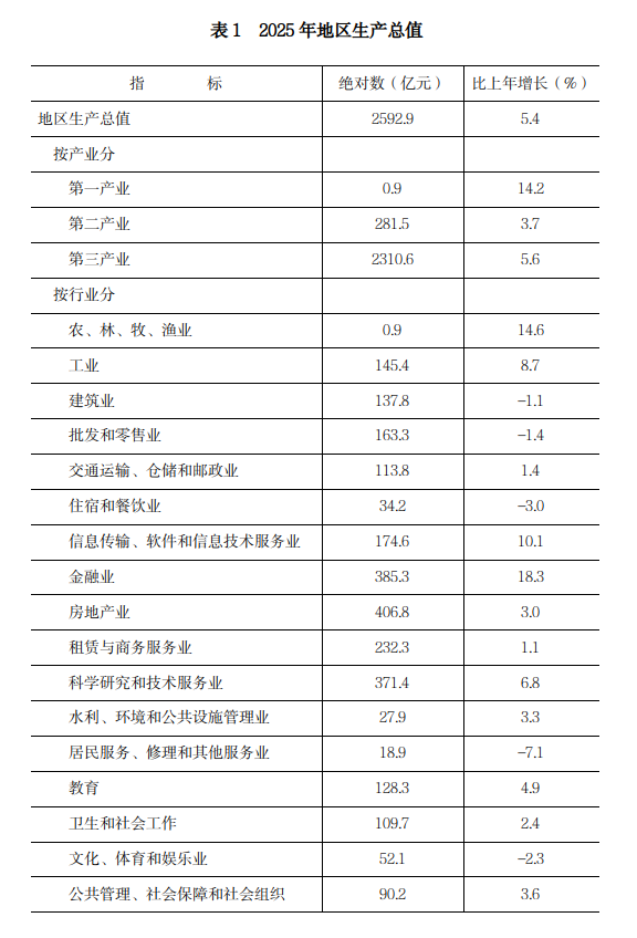 经济发展:初步核算,全年实现地区生产总值2592.9亿元,按不变价格计算,比上年增长5.4%。其中,第一产业增加值0.9亿元,增长14.2%;第二产业增加值281.5亿元,增长3.7%;第三产业增加值2310.6亿元,增长5.6%。三次产业构成为0.03:10.9:89.1。