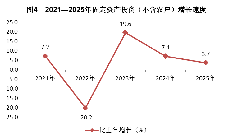 固定资产投资:全年固定资产投资(不含农户)比上年增长3.7%。分产业看,第二产业投资增长70%;第三产业投资增长2.6%。分领域看,建安投资增长6.9%,基础设施投资增长22.2%,民间投资下降20.1%。