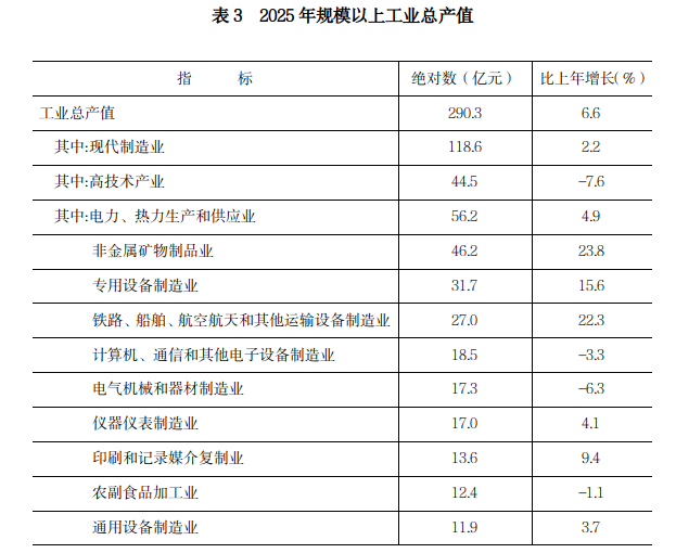 工业:全年规模以上工业企业实现工业总产值290.3亿元,比上年增长6.6%。从主要行业看,非金属矿物制品业增长23.8%,铁路、船舶、航空航天和其他运输设备制造业增长22.3%,专用设备制造业增长15.6%,电力、热力生产和供应业增长4.9%。