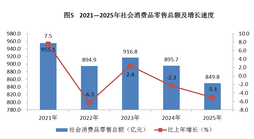 全年实现社会消费品零售总额849.8亿元,比上年下降5.1%。其中,限额以上批发零售业和住宿餐饮业实现网上零售额141亿元,下降4.8%。按消费形态分,商品零售729.1亿元,比上年下降4.9%;餐饮收入120.8亿元,下降6.6%。