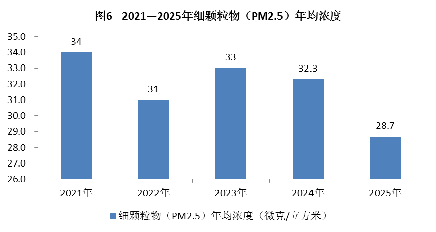 全区细颗粒物(PM2.5)和可吸入颗粒物(PM10)年均浓度分别为28.7微克/立方米和54微克/立方米,分别比上年下降11.1%和10%。二氧化氮(NO2)年均浓度为26微克/立方米,比上年下降10.3%;二氧化硫(SO2)年均浓度为3微克/立方米,与上年持平。